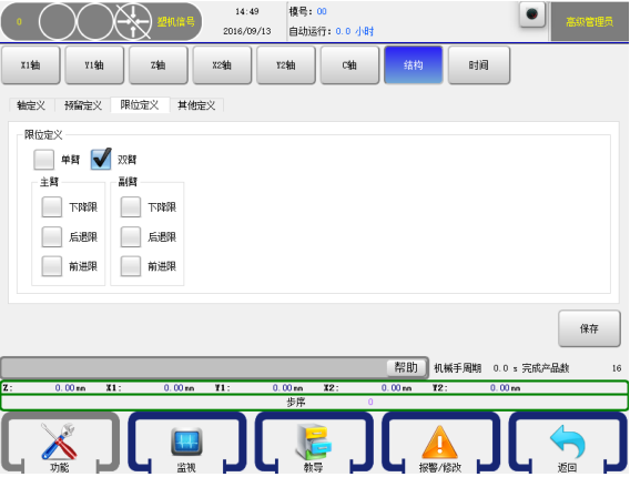 副臂:下降限,后退限,前进限。若副臂为气动轴,则限位有效,当相应的气动轴动作时,必须有限位信号,程序才会执行下一步。否则报警超时。