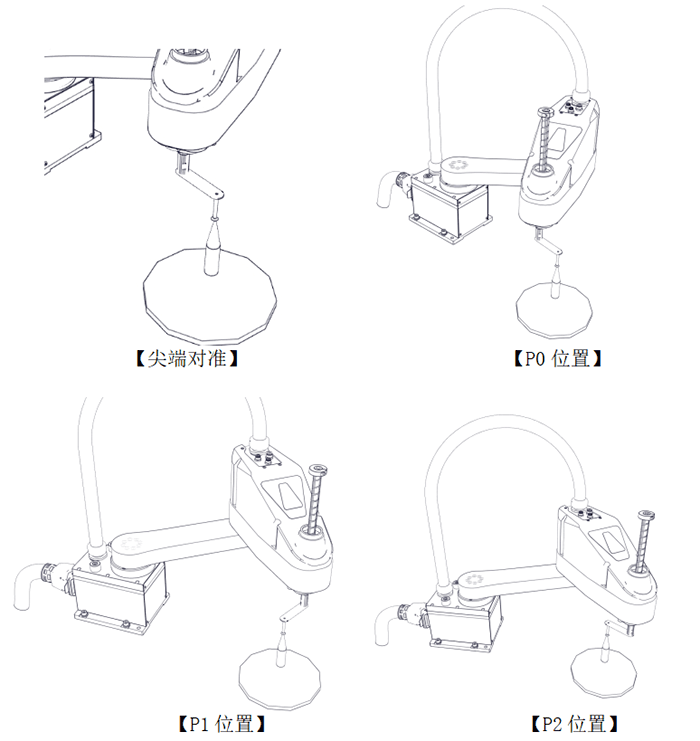 3)移动机械手到标定点正上方,机械手的尖端要与标定工具的尖端对准,设入P0;转到U轴获取新的角度,移动机械手使其尖端对准标定工具的尖端,设入P1(P1的U轴角度要与P0的U轴角度相差90~120度);再次转到U轴获取新的角度,移动机械手使其尖端对准标定工具的尖端,设入P2(P2的U轴角度要与P0/P1的U轴角度相差90~120度)。示意图如下: